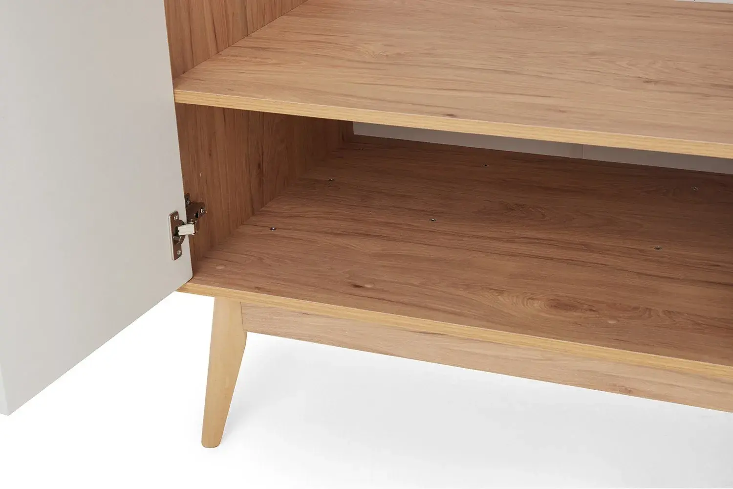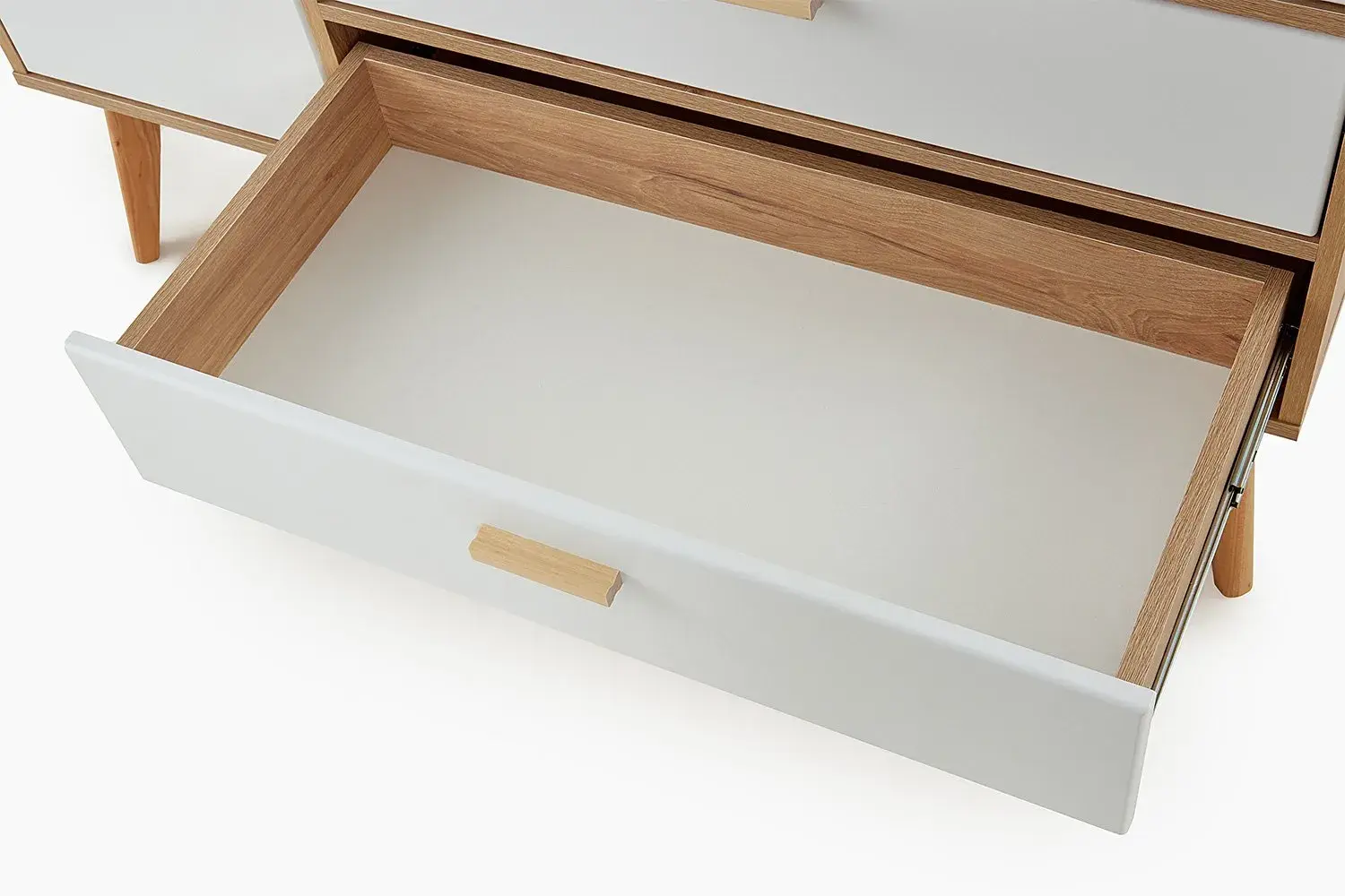 Каркас комода изготовлен из ЛДСП в цвет натурального дуба, фасады ящиков – из МДФ белого матового цвета, стильные, крепкие и устойчивые ножки - из массива березы. Материалы отличаются экологичностью, прочностью, долго сохраняют внешнюю привлекательность, просты в уходе.