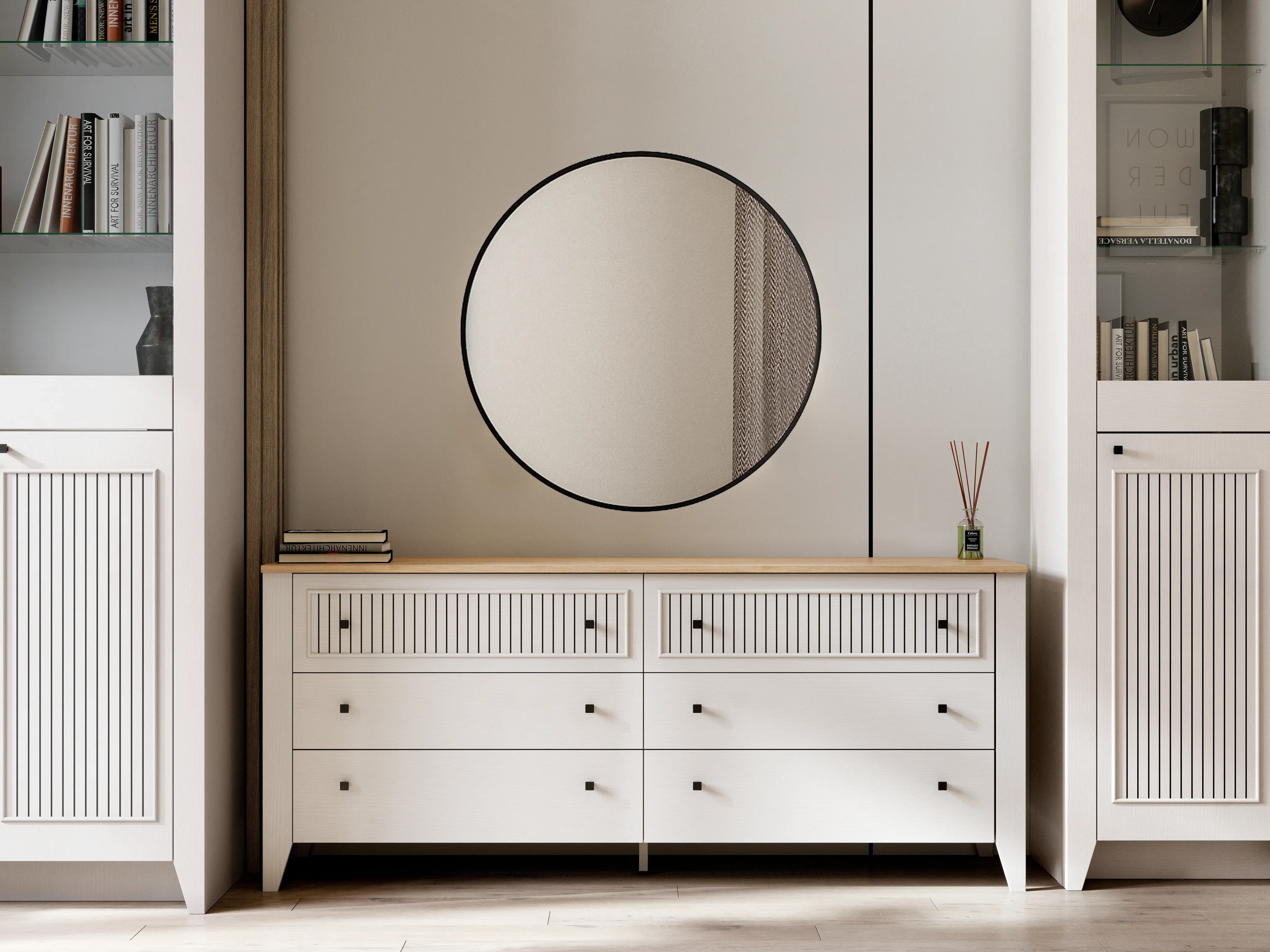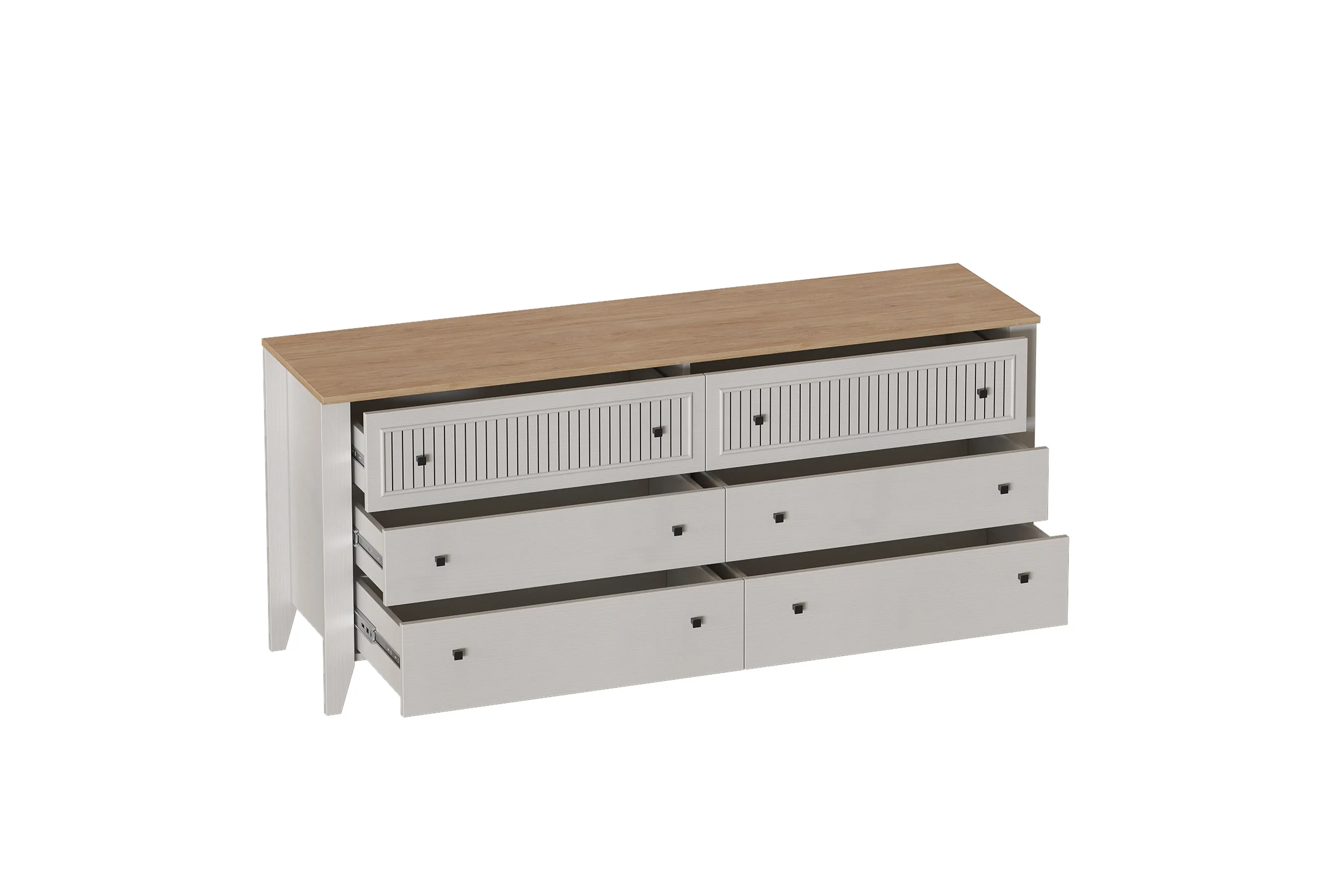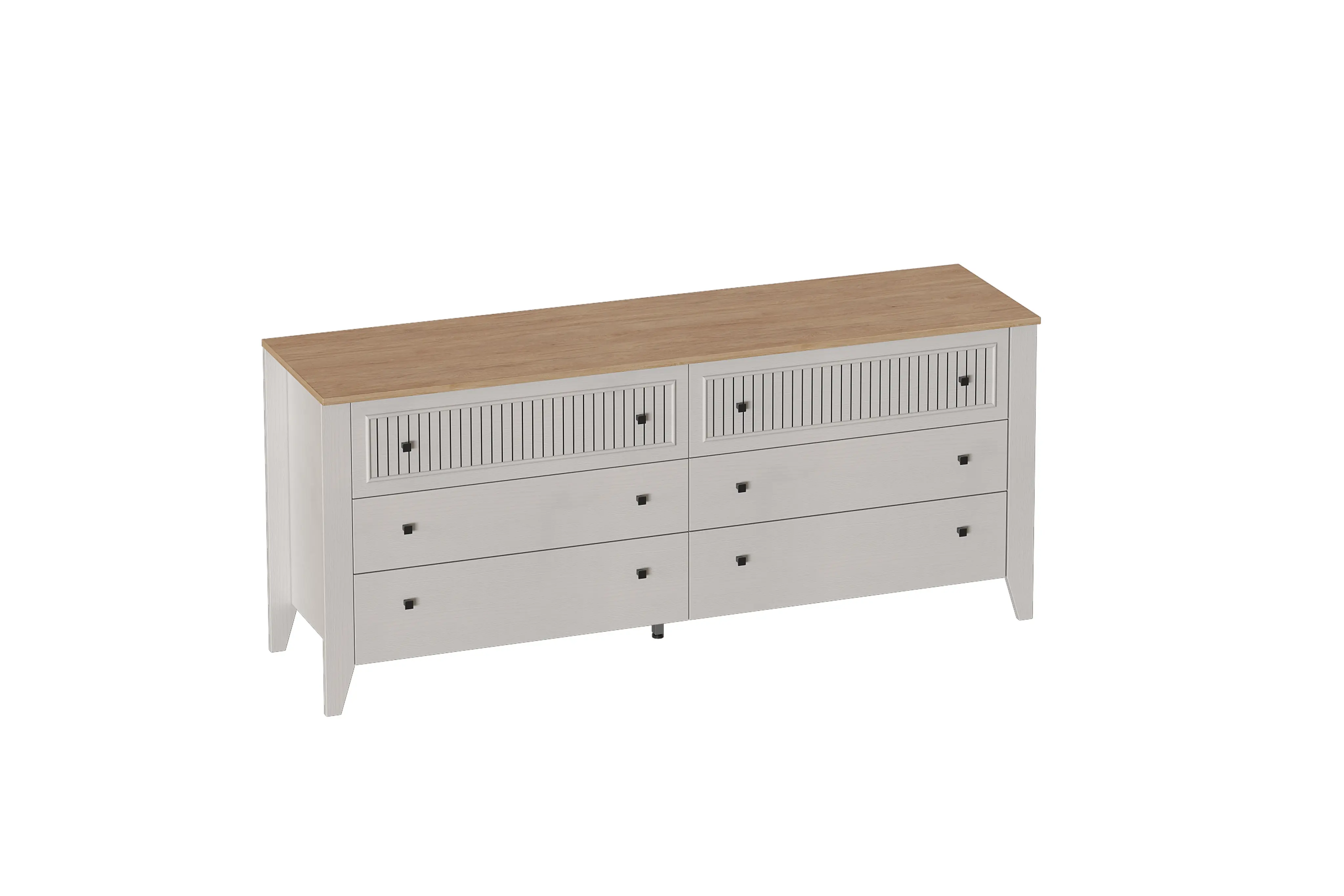 Комод "Валенсия" выполнен в комбинации Дуб натуральный светлый / Персидский жемчуг и состоит из выдвижных ящиков на шариковых направляющих (без амортизаторов), что позволяет удобно хранить вещи и поддерживать порядок в комнате. Он выполнен из безопасных, качественных материалов, что гарантирует долговечность и сохранение первоначального вида на протяжении долгого времени.