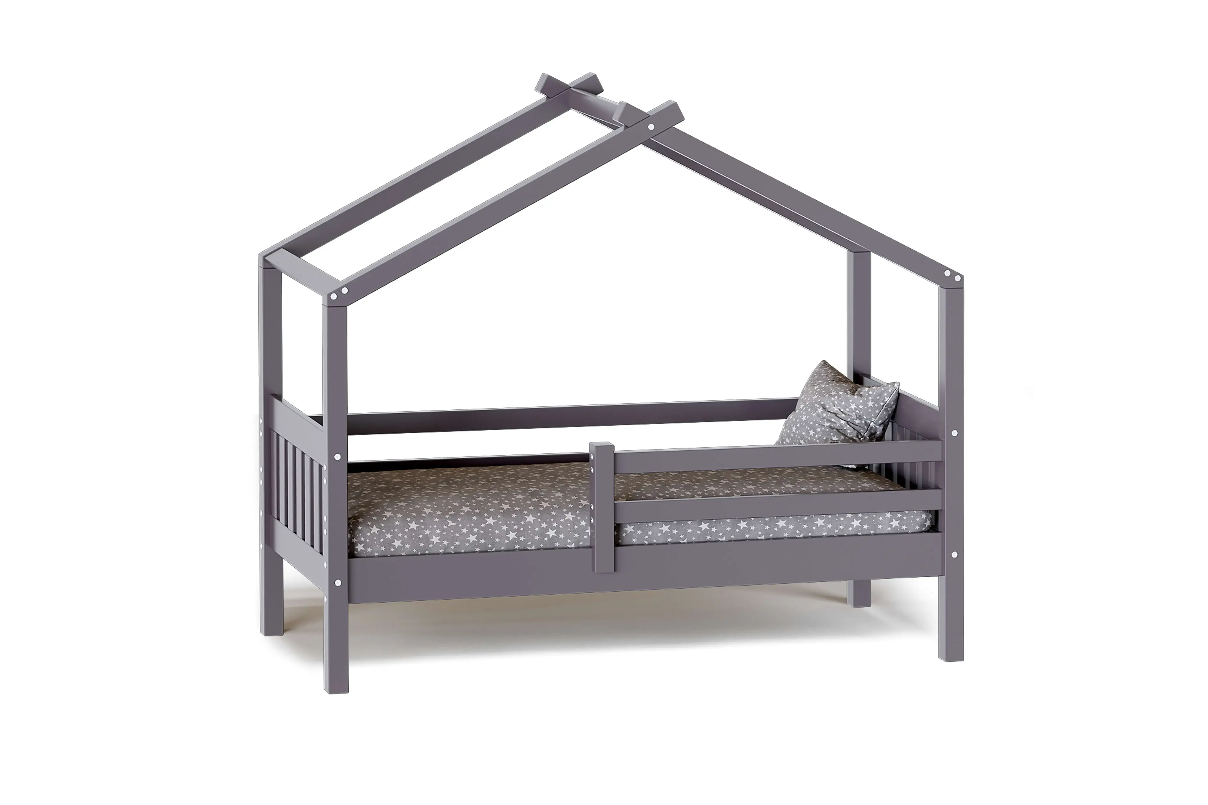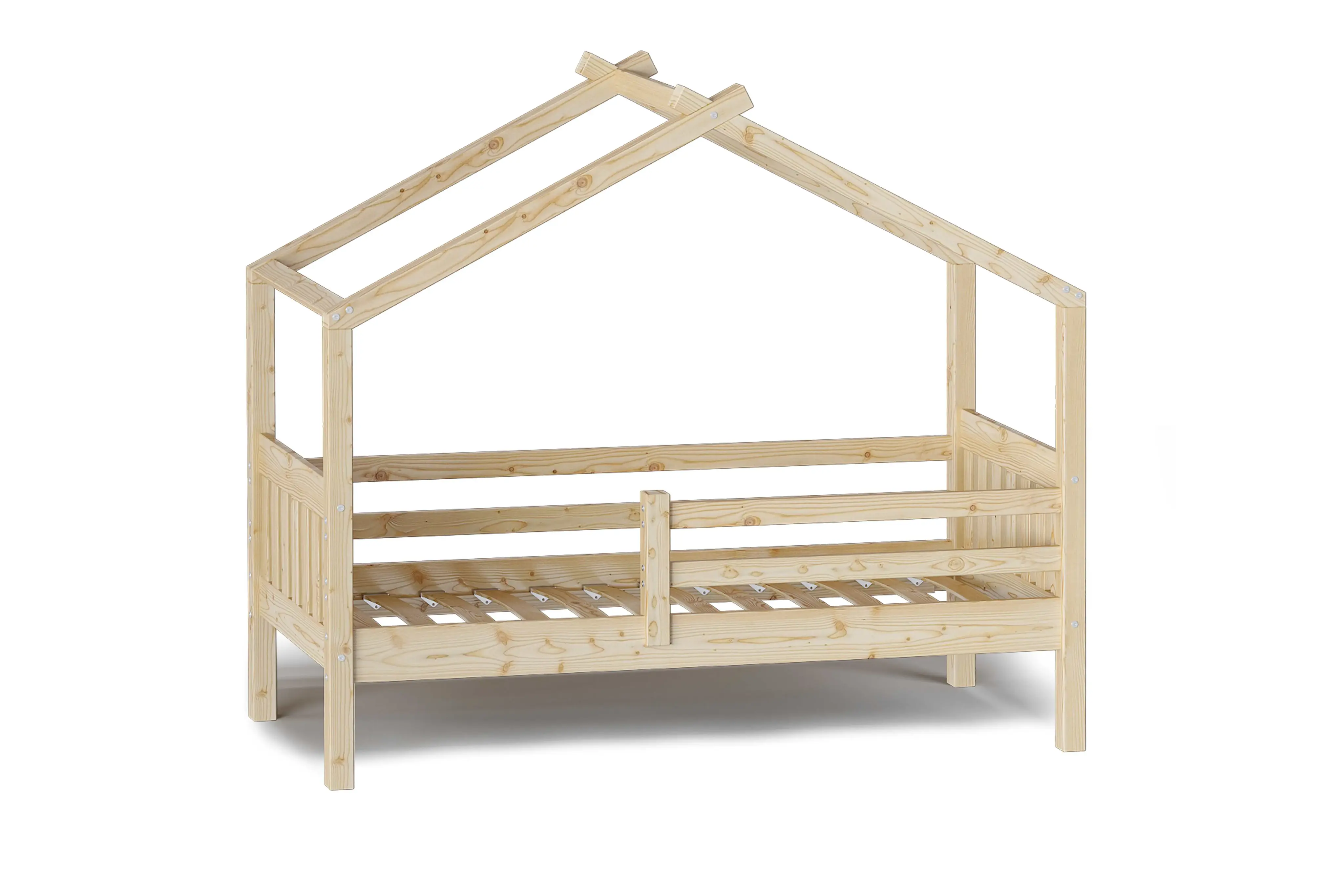 Каркас укомплектован основанием из поперечных гнутых ламелей. Головная и ножная спинки соединены стропилами, образующими крышу, благодаря чему малыш будет ощущать себя в собственном уютном домике. В комплектацию кровати входит ортопедическое основание из гнутоклееных ламелей.