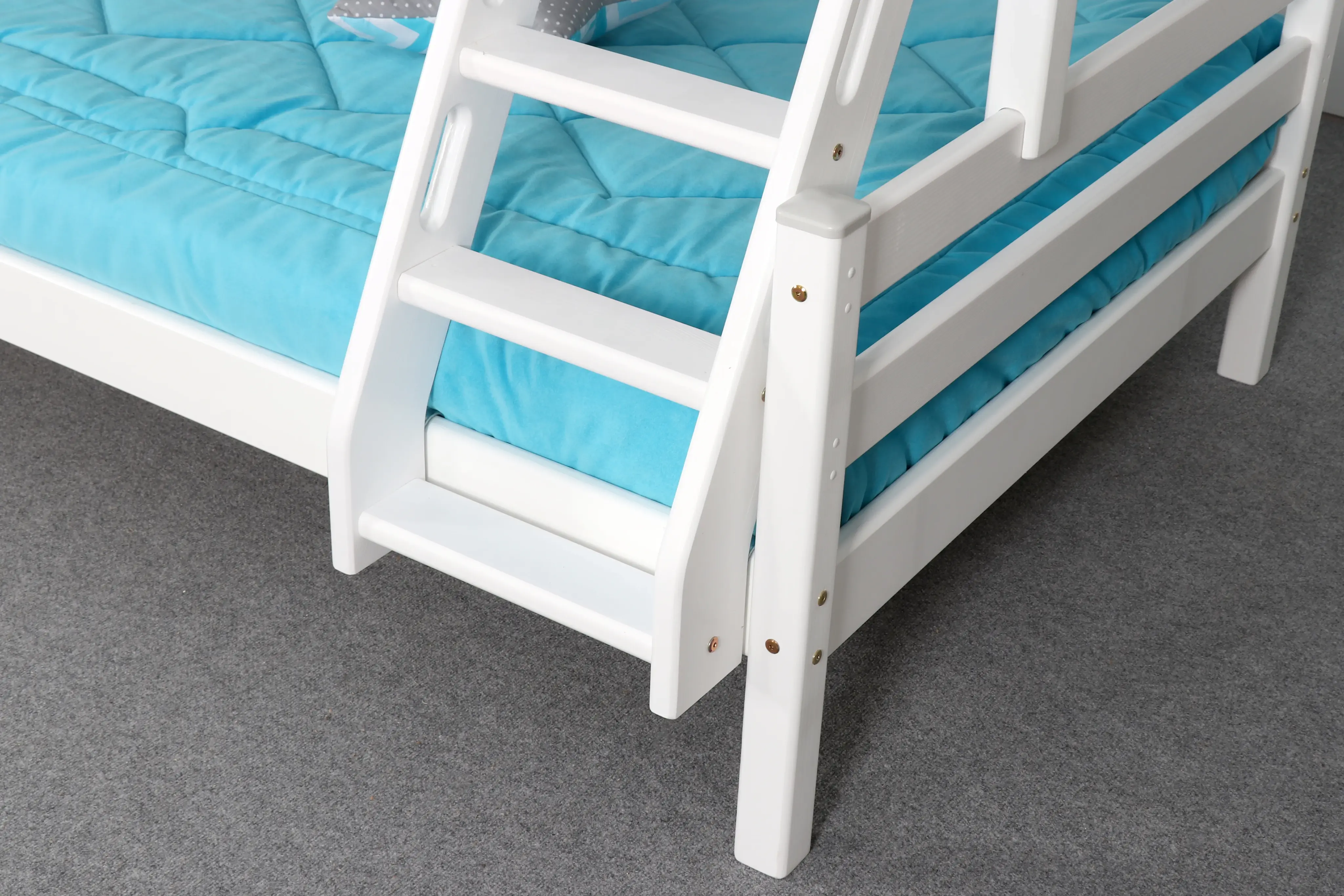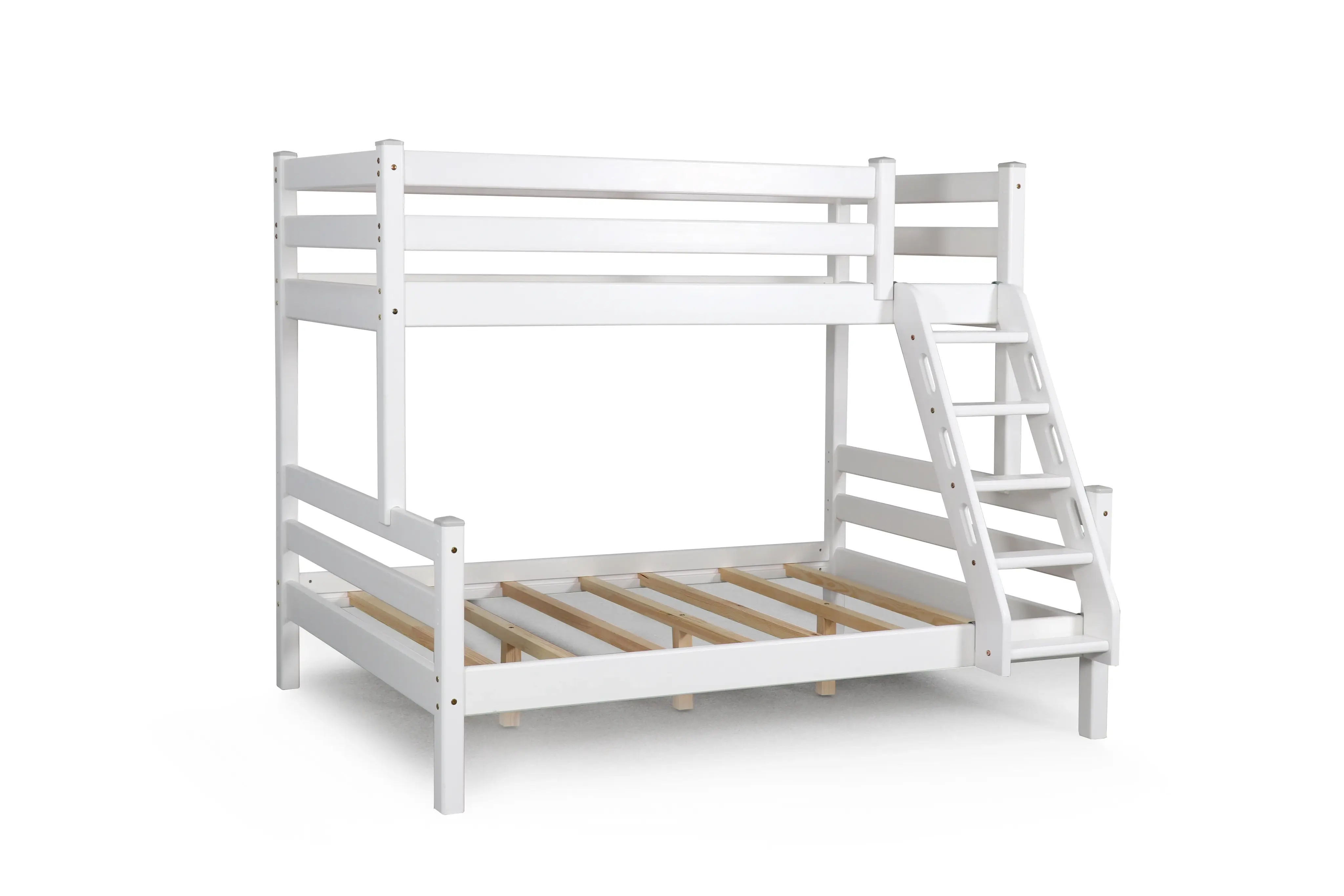 Увеличенное до 120 см по ширине спальное место нижнего яруса подходит для подростка, чей вес не превышает 70 кг. Верхнее основание имеет вид гнутых ламелей, с усиливающей перемычкой по периметру, нижнее представлено опорными брусками с уложенным поверх них настилом из шлифованного МДФ 10мм. Массив сосны подвергнут тщательной шлифовке и покрыт безопасным лаком на водной основе.