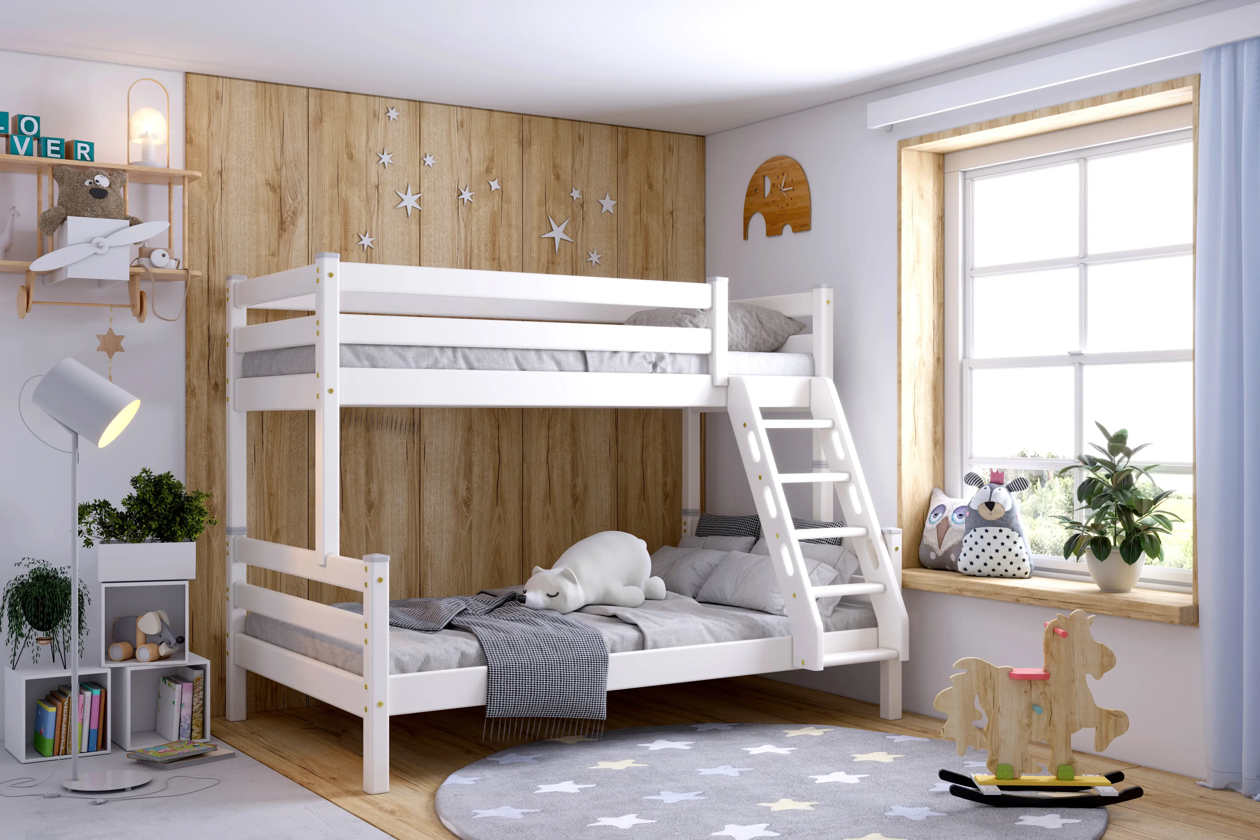 Продуманная конструкция и качественные материалы делают двухъярусную кровать Адель отличным выбором для двух детей, живущих в одной комнате. Модель оснащена бортиком безопасности и наклонной лестницей для легкого доступа к верхнему уровню.