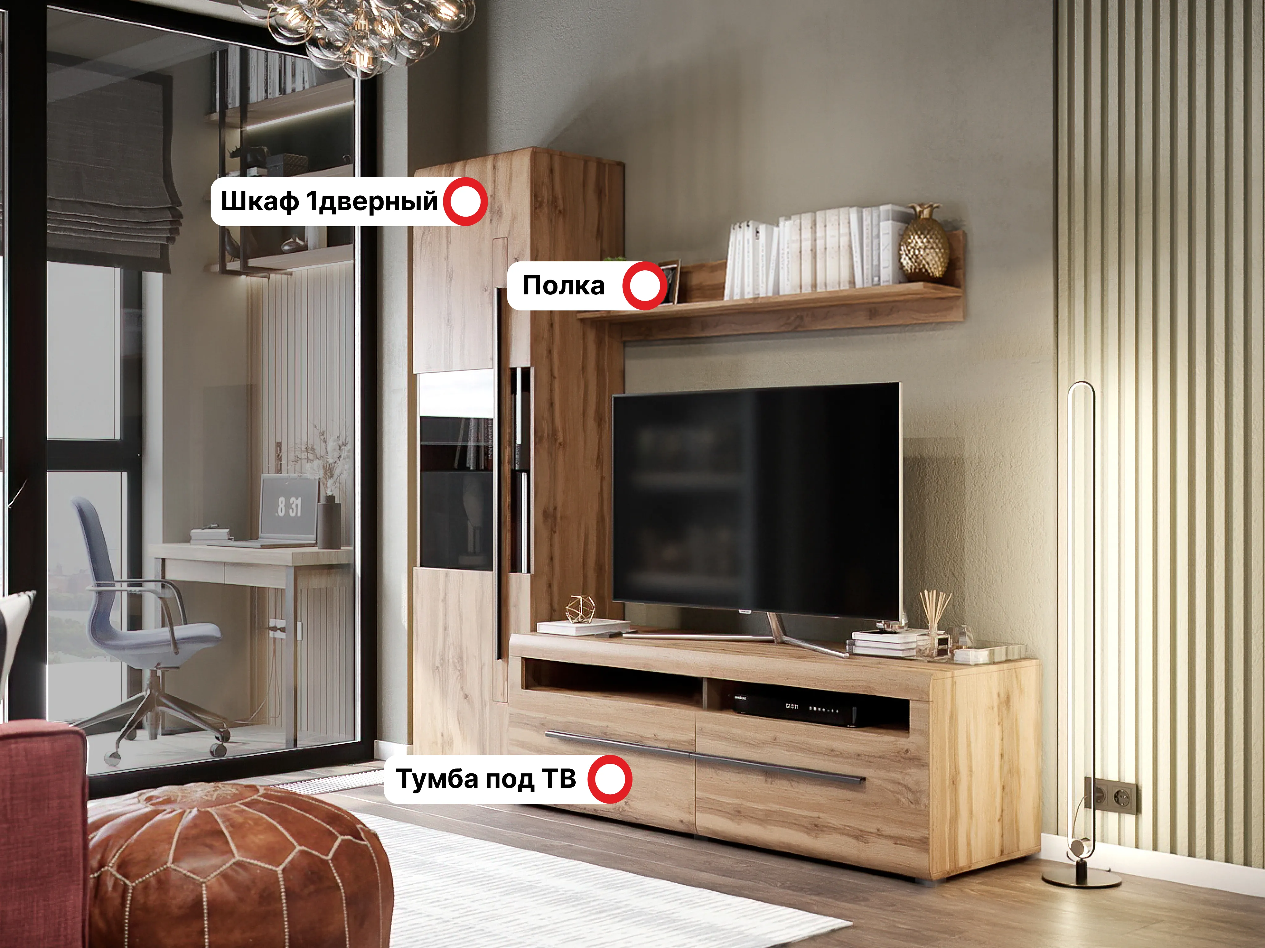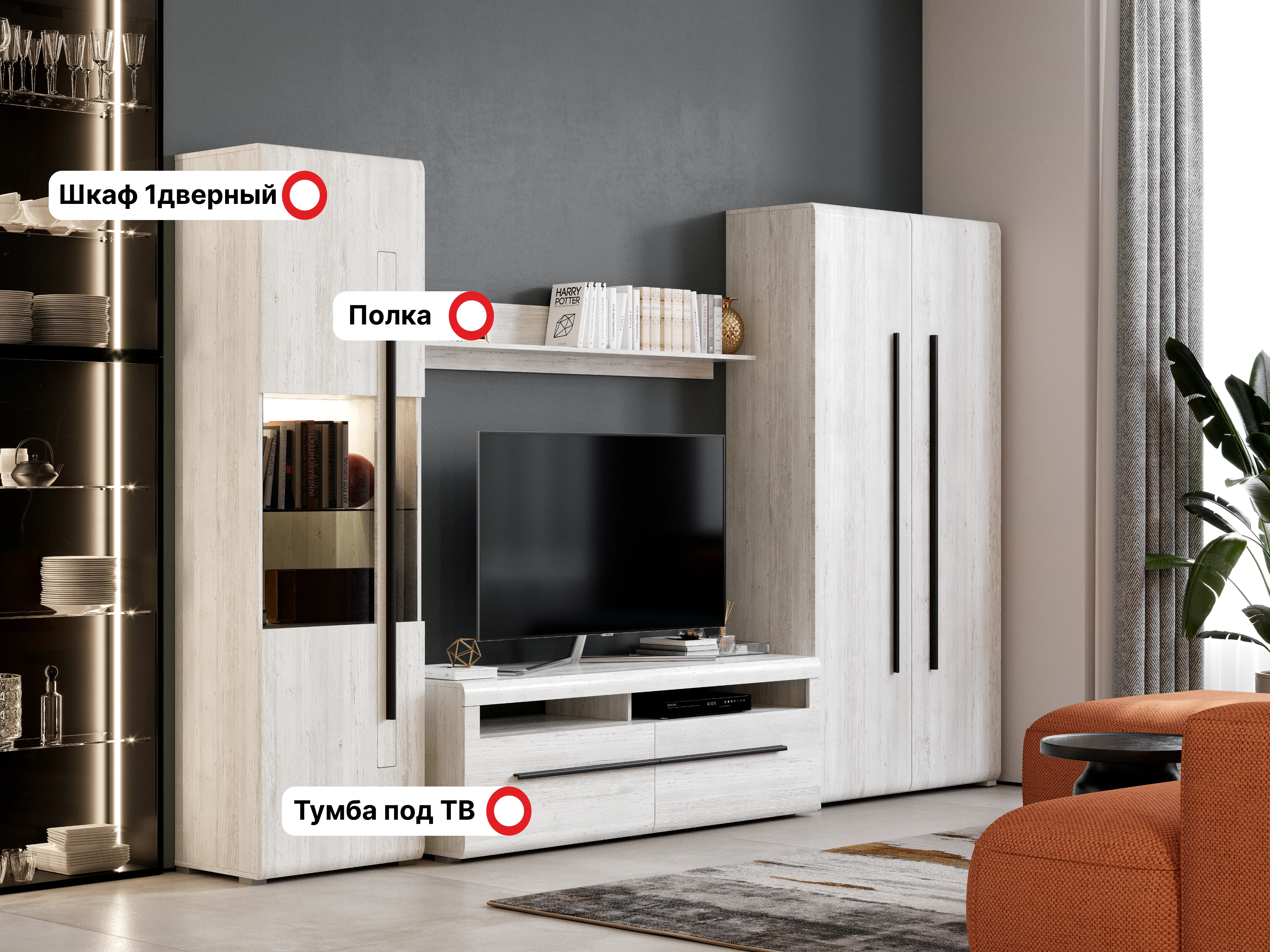 Вы можете воспользоваться готовым решением или выбрать только те элементы, которые вам нужны, комбинируя их по своему усмотрению. Таким образом, вы получаете возможность создать гостиную, идеально подходящую под размеры и планировку помещения.
