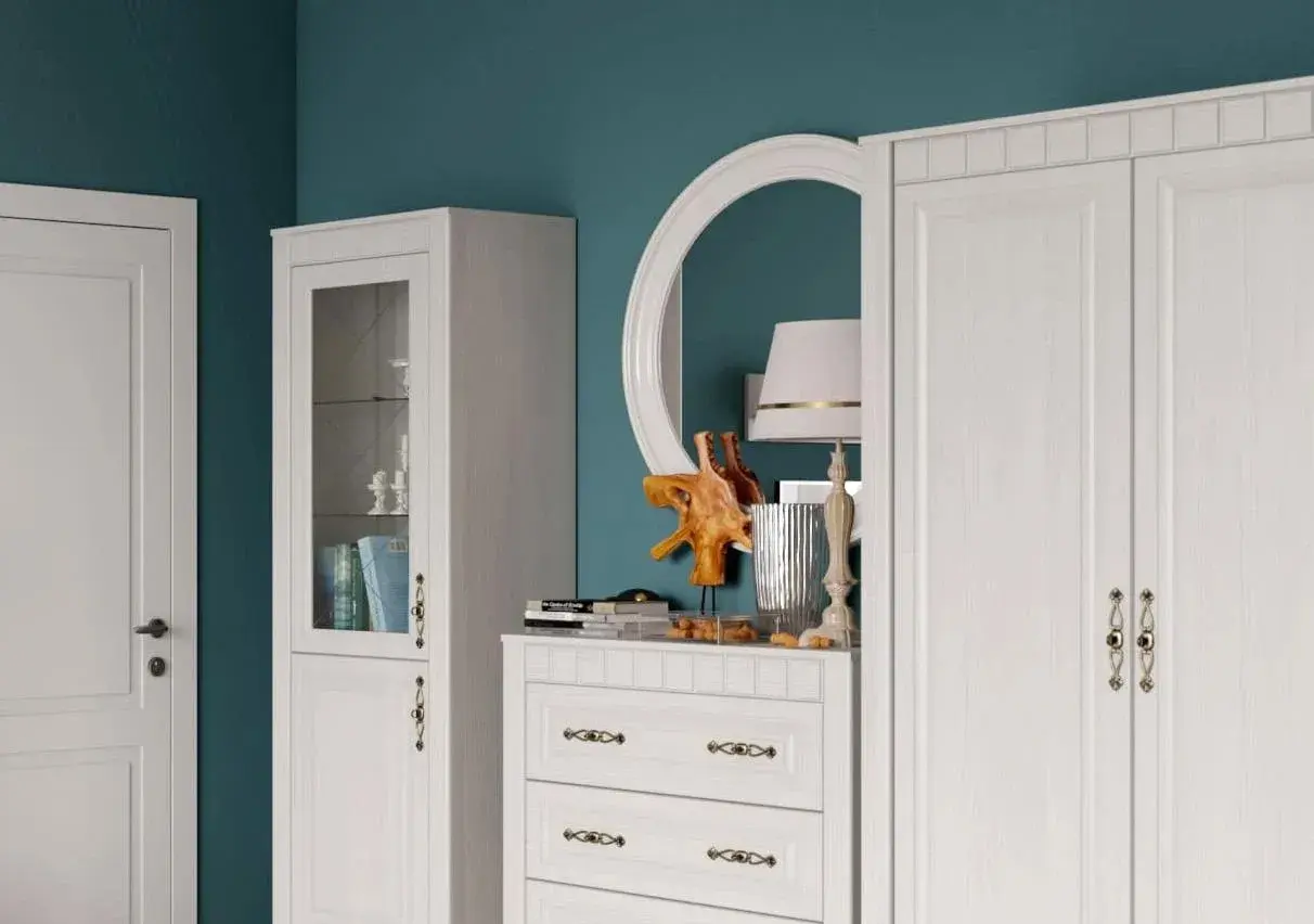 Рамочные фасады с фрезеровкой поддерживают романтичный стиль французской провинции, а ручки-кнопки придают мебели особое обаяние, свойственное прованскому стилю. Стекло шкафа-витрины декорировано алмазной гравировкой в виде ромбов.