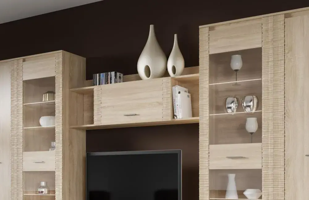 Полка крепится к боковинам двух любых шкафов или витрин из набора для гостиной. На боковинах этих элементов при сборке сверлятся по четыре сквозных отверстия диаметром 7 мм, путём рассверливания уже имеющихся отверстий меньшего диаметра.