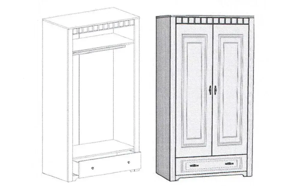 В шкафу расположены две распашные двери и в нижней части ящик на шариковых направляющих глубиной 500 мм. За распашными дверьми расположено отделение для одежды со стальной штангой.