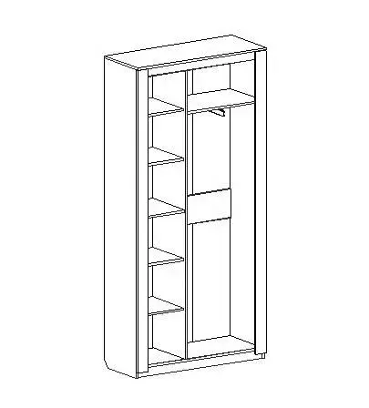 Двухдверный шкаф "Элана" с распашными дверцами имеет два отделения: отделение для белья с четырьмя съёмными и центральной стационарной полкой; платяное отделение со стационарной полкой и выдвижной стальной штангой.