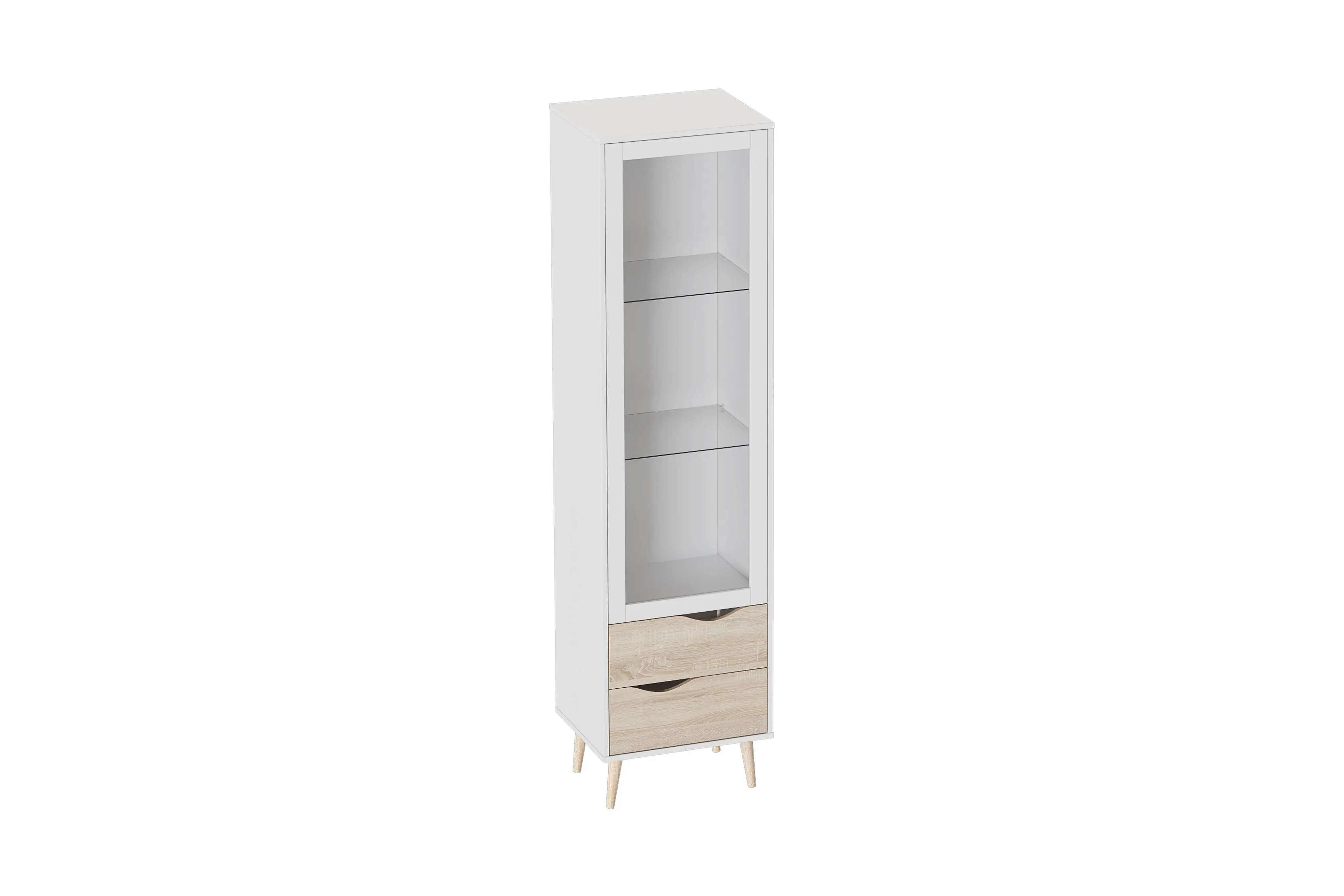 Шкаф-витрина "Соната" будет одинаково гармонично смотреться как в составе мебельной композиции, так и установленный отдельно. Распашная дверца со стеклом и белоснежным фасадом из ЛДСП защитит коллекционный фарфор, декоративную посуду или книги от пыли, обеспечивая при этом прекрасный обзор всего содержимого полок. В нижней секции, оборудованной двумя выдвижными ящиками с фасадами, декорированными прорезными ручками, можно хранить предметы, имеющие более утилитарное назначение.