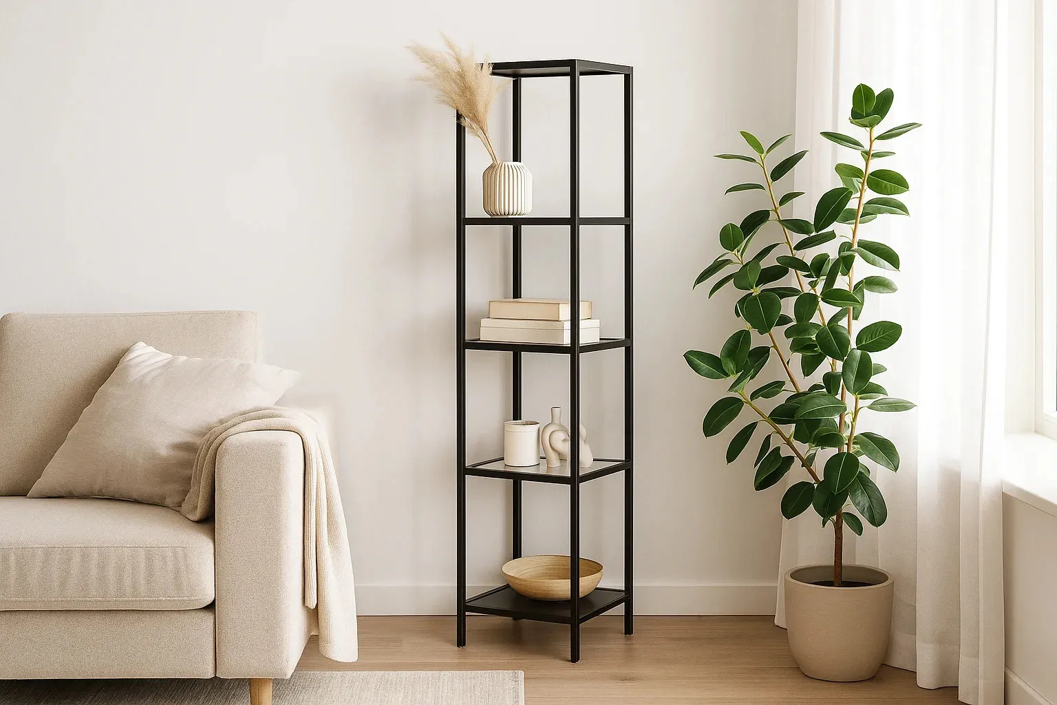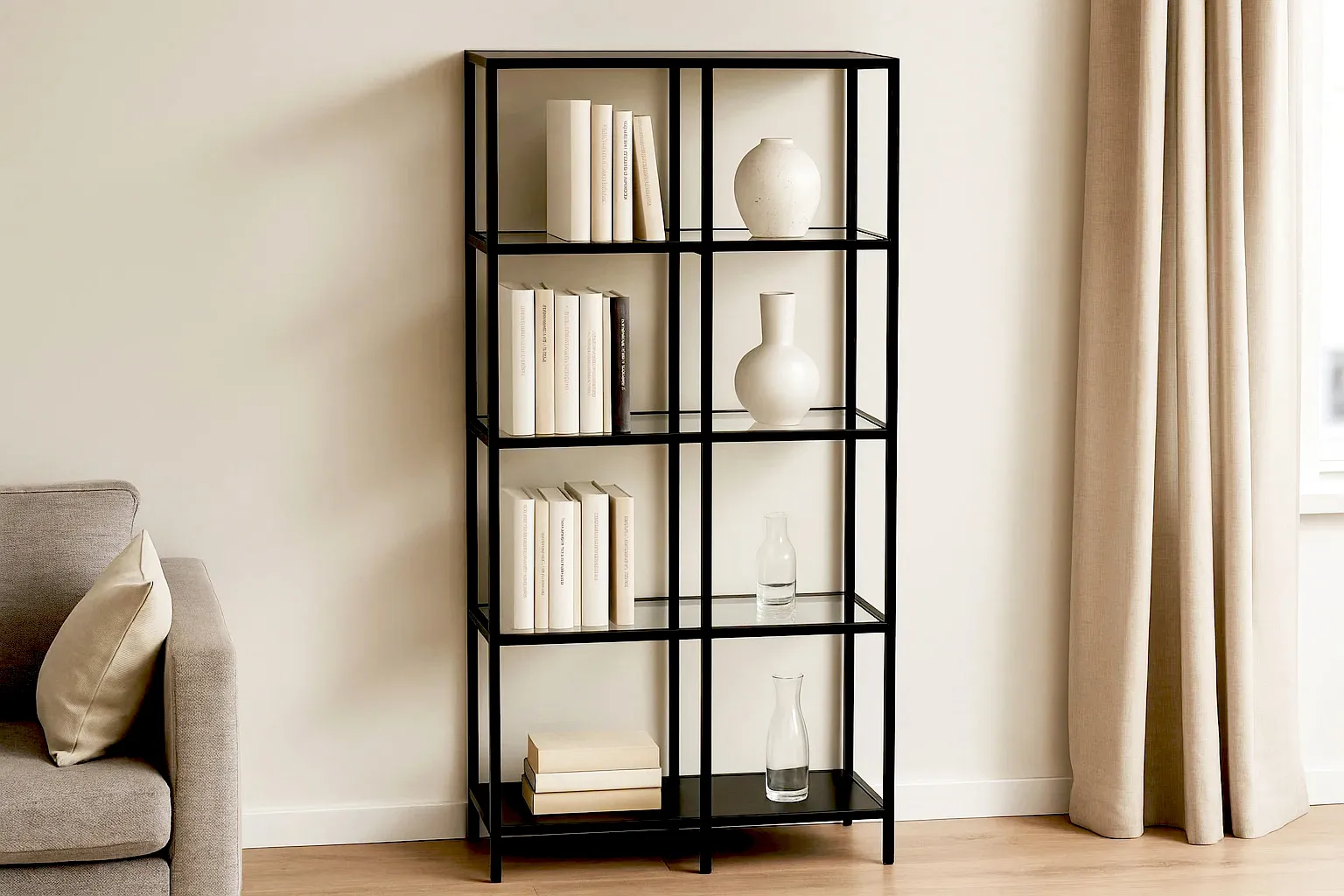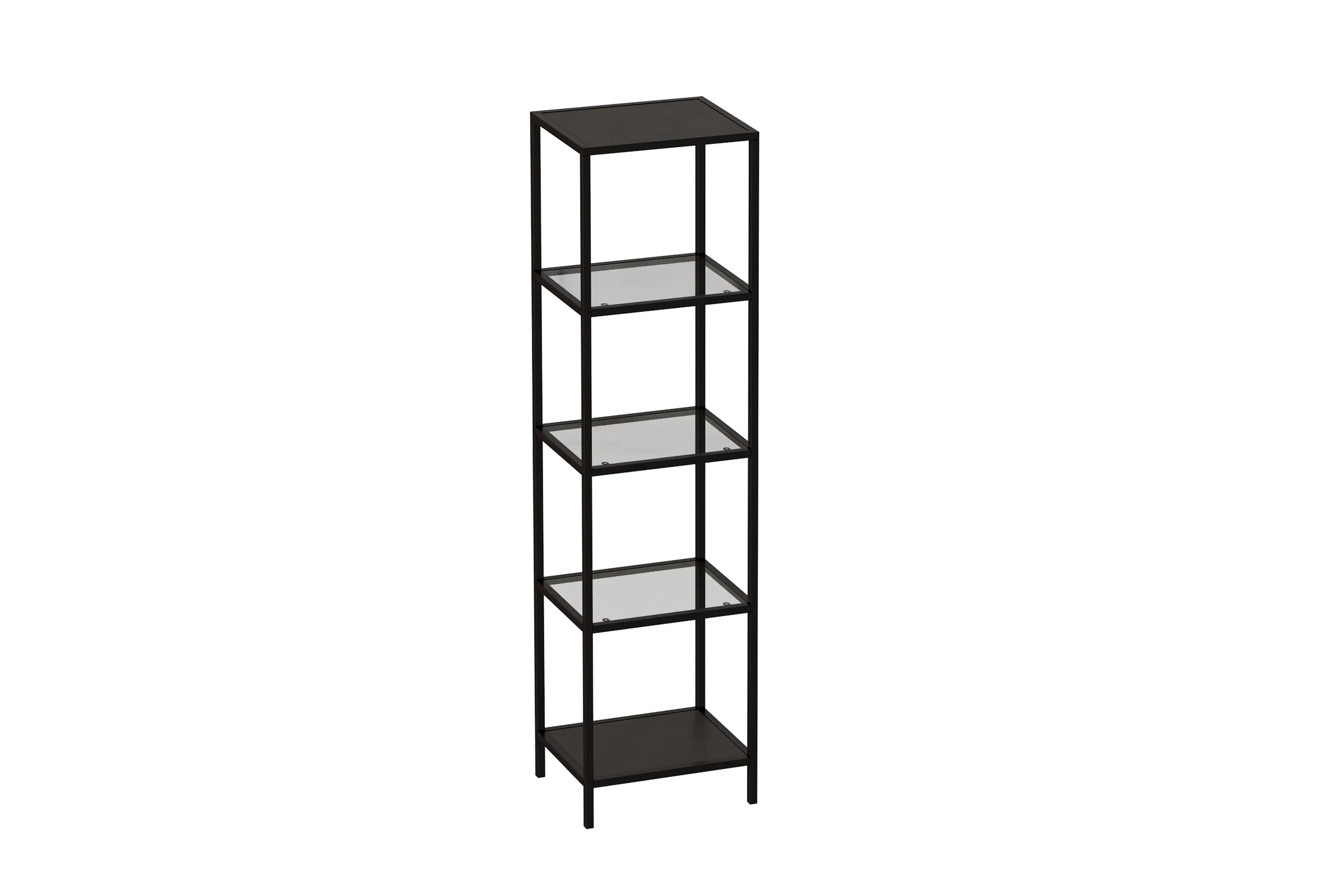 Стеллаж со стеклянными полками "Нора". Опорой для стеллажа служит черный металлокаркас. Верхняя и нижние полки металлические. Средние выполнены из прозрачного стекла толщиной 5 мм. Опоры регулируются по высоте. Предусмотрены отверстия для фиксации к стене.
