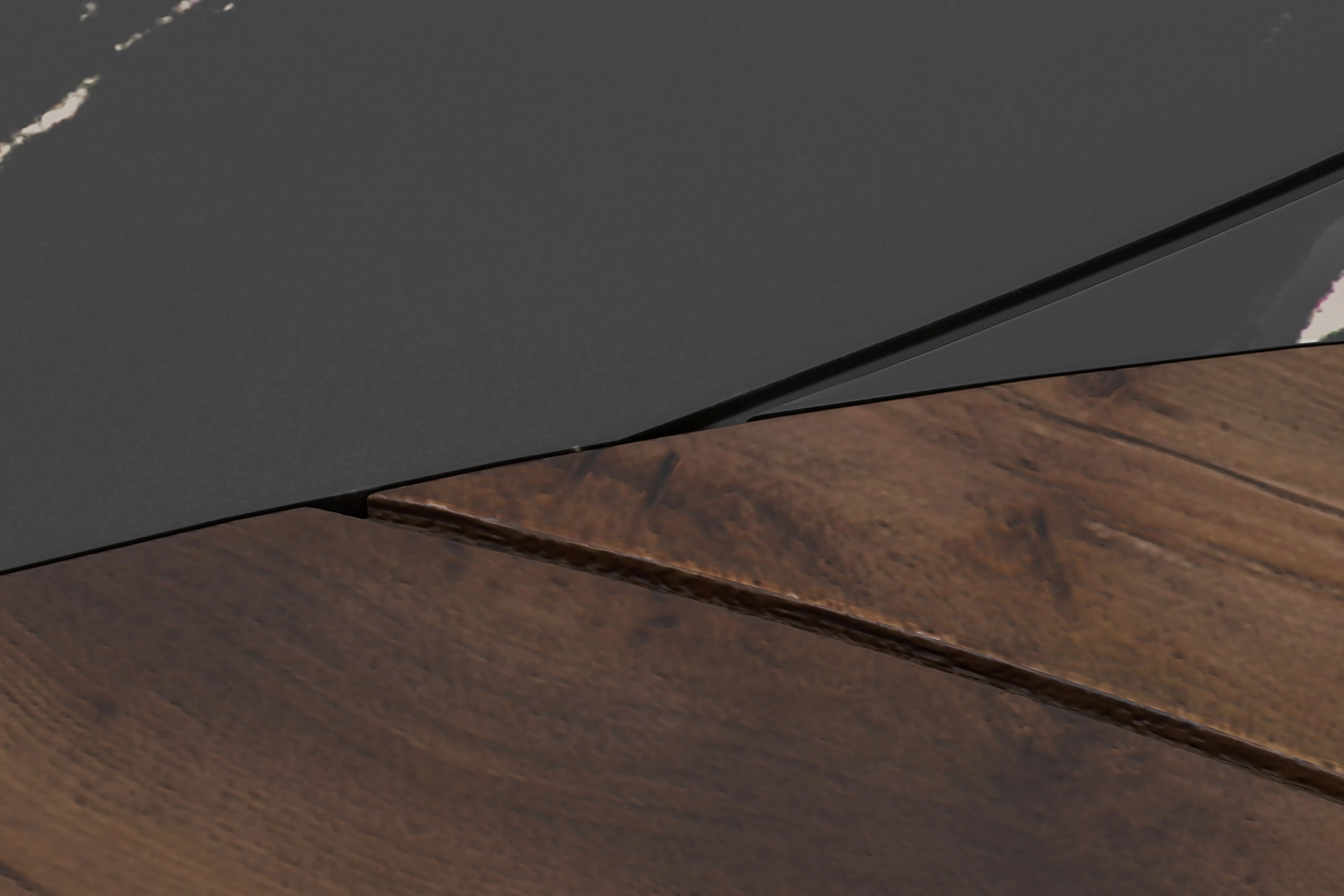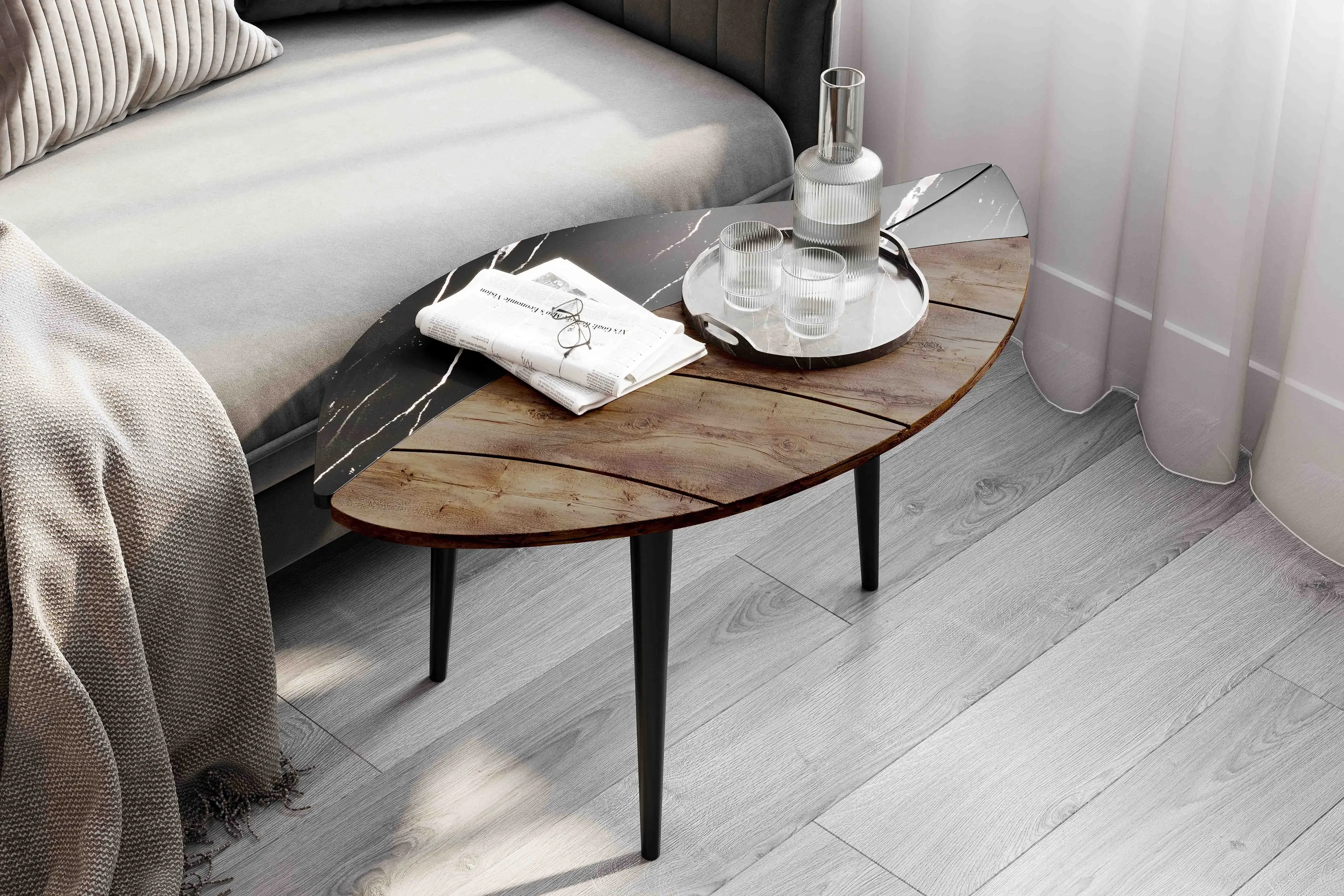 Особенностью дизайнерского решения журнального стола №17 является оригинальное сочетание фигурных элементов столешницы в форме листа дерева. Опоры выполнены из дерева.