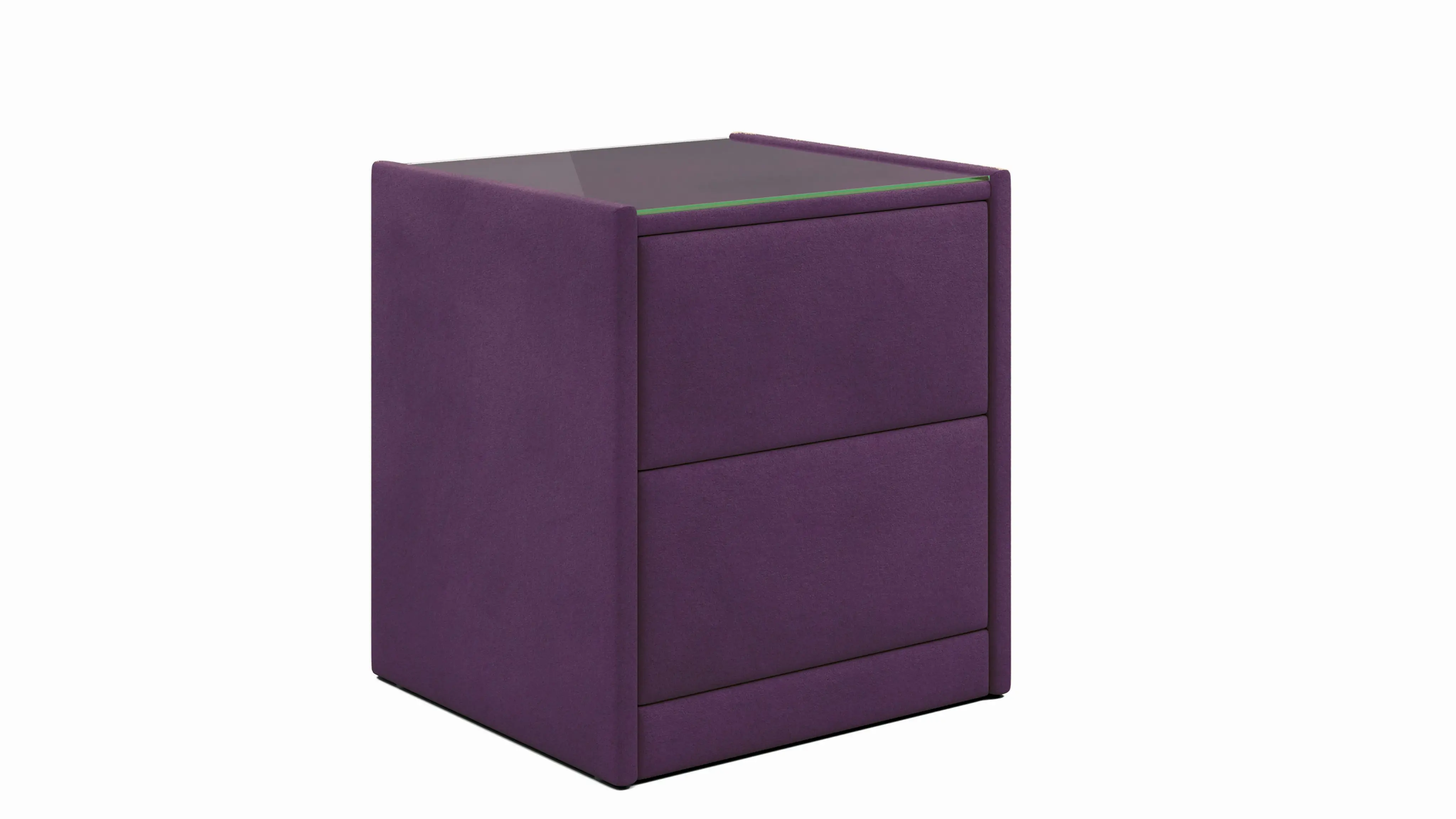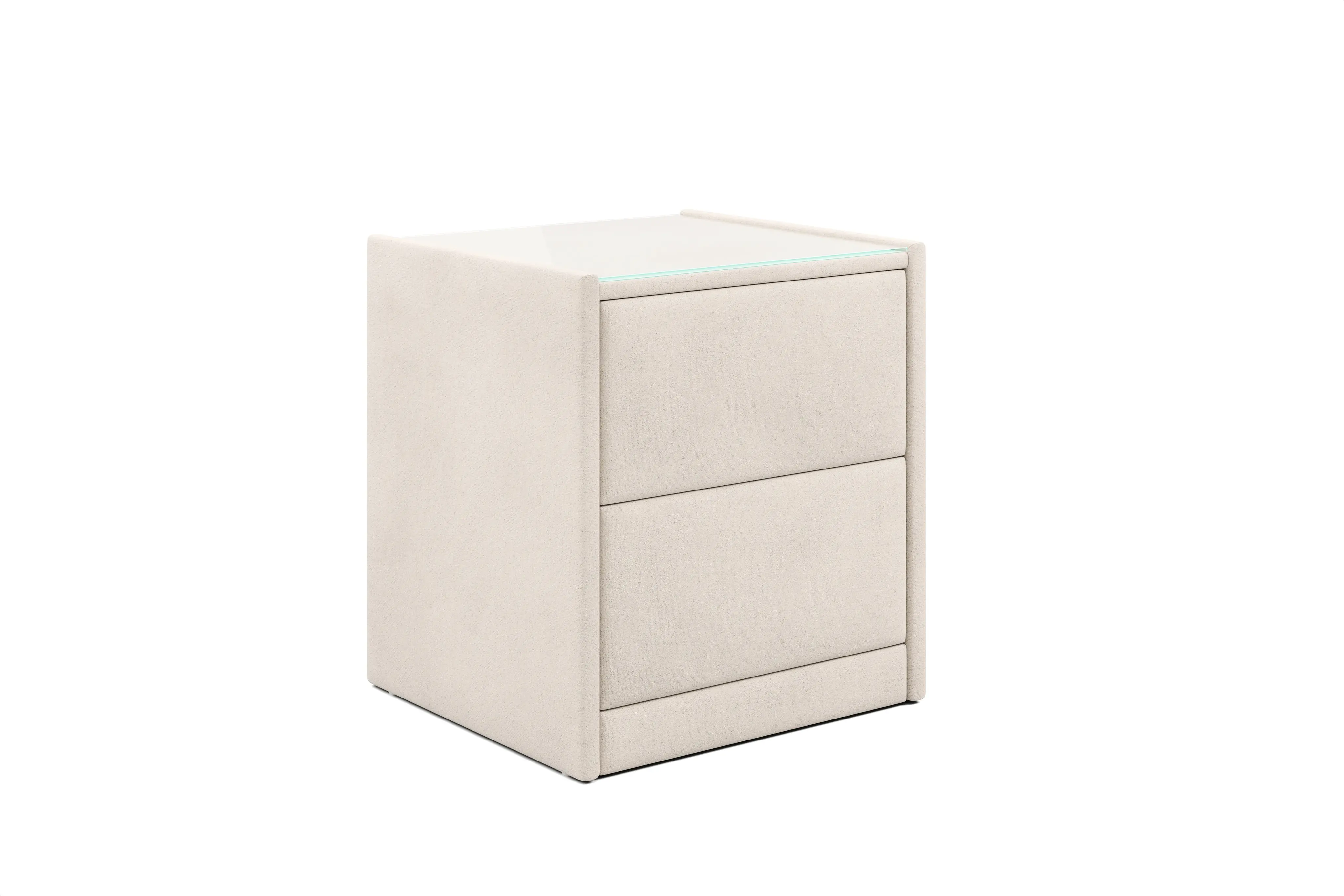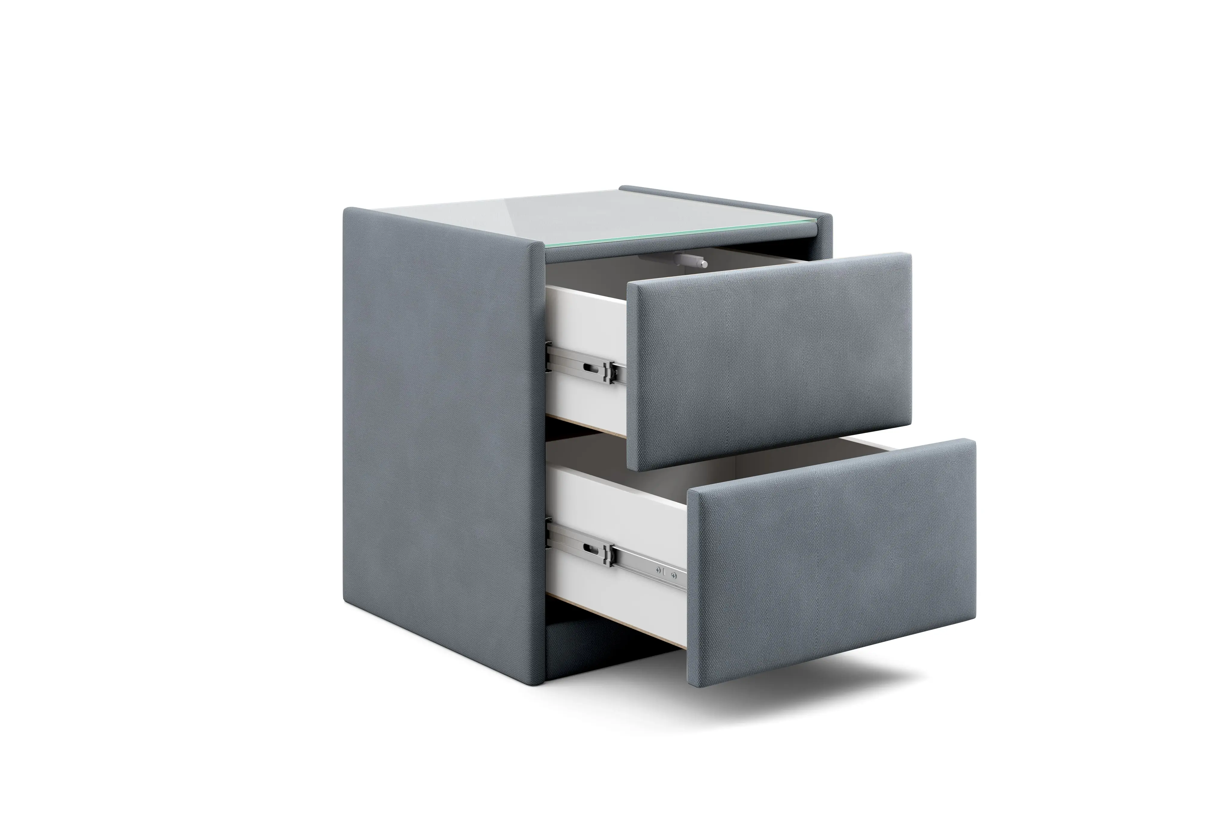 Тумба обтянута высококачественным велюром, что придает ей особый уют и комфорт. Имеет стеклянную столешницу и два вместительных выдвижных ящика с механизмом Push to open. Скругленные торцы модели, минимизируют риск удариться в темноте.