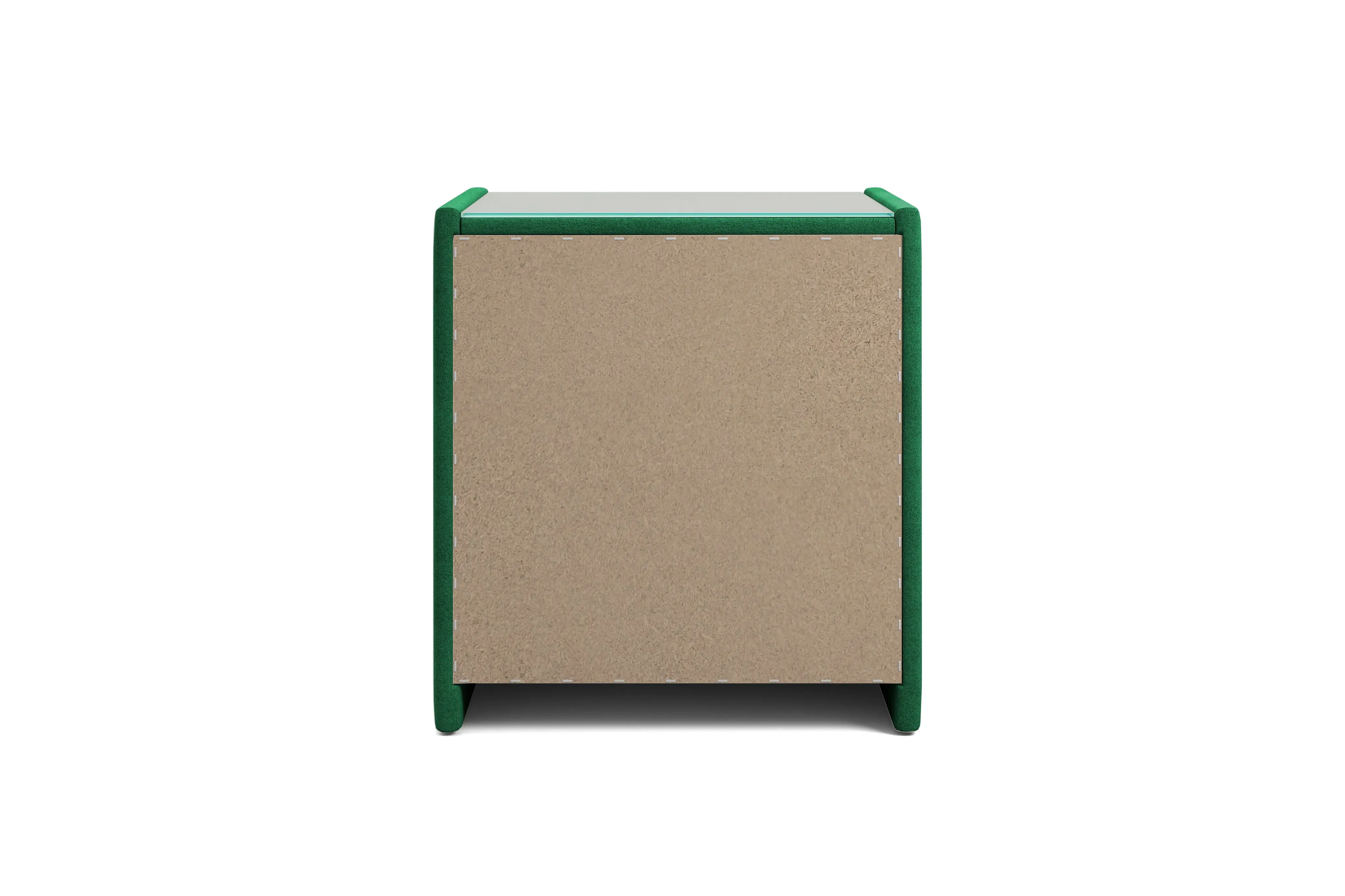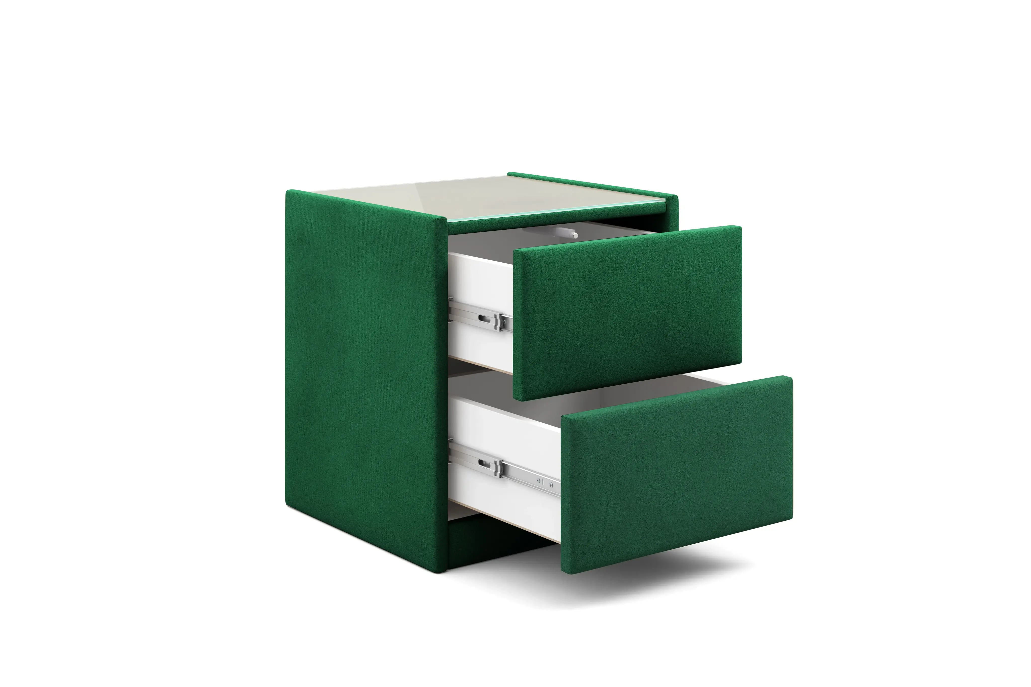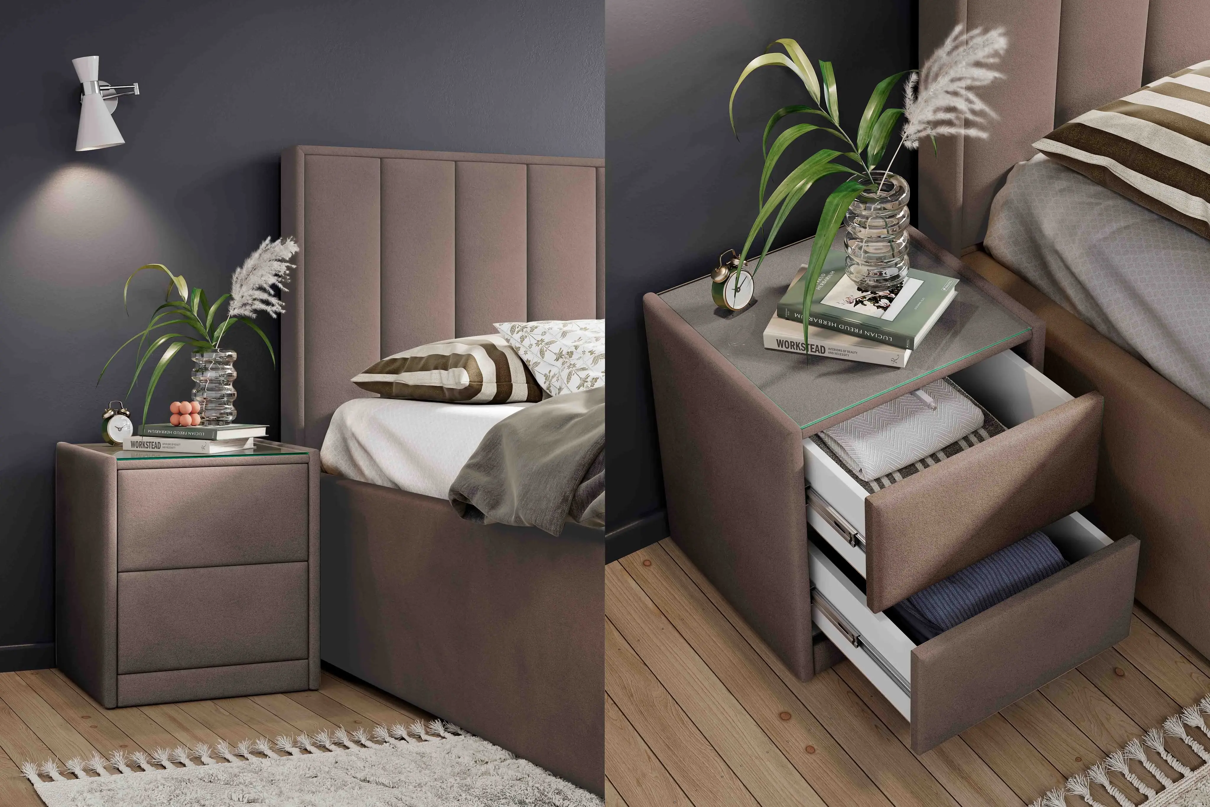Тумба обтянута высококачественным велюром, что придает ей особый уют и комфорт. Имеет стеклянную столешницу и два вместительных выдвижных ящика с механизмом Push to open. Скругленные торцы модели, минимизируют риск удариться в темноте.