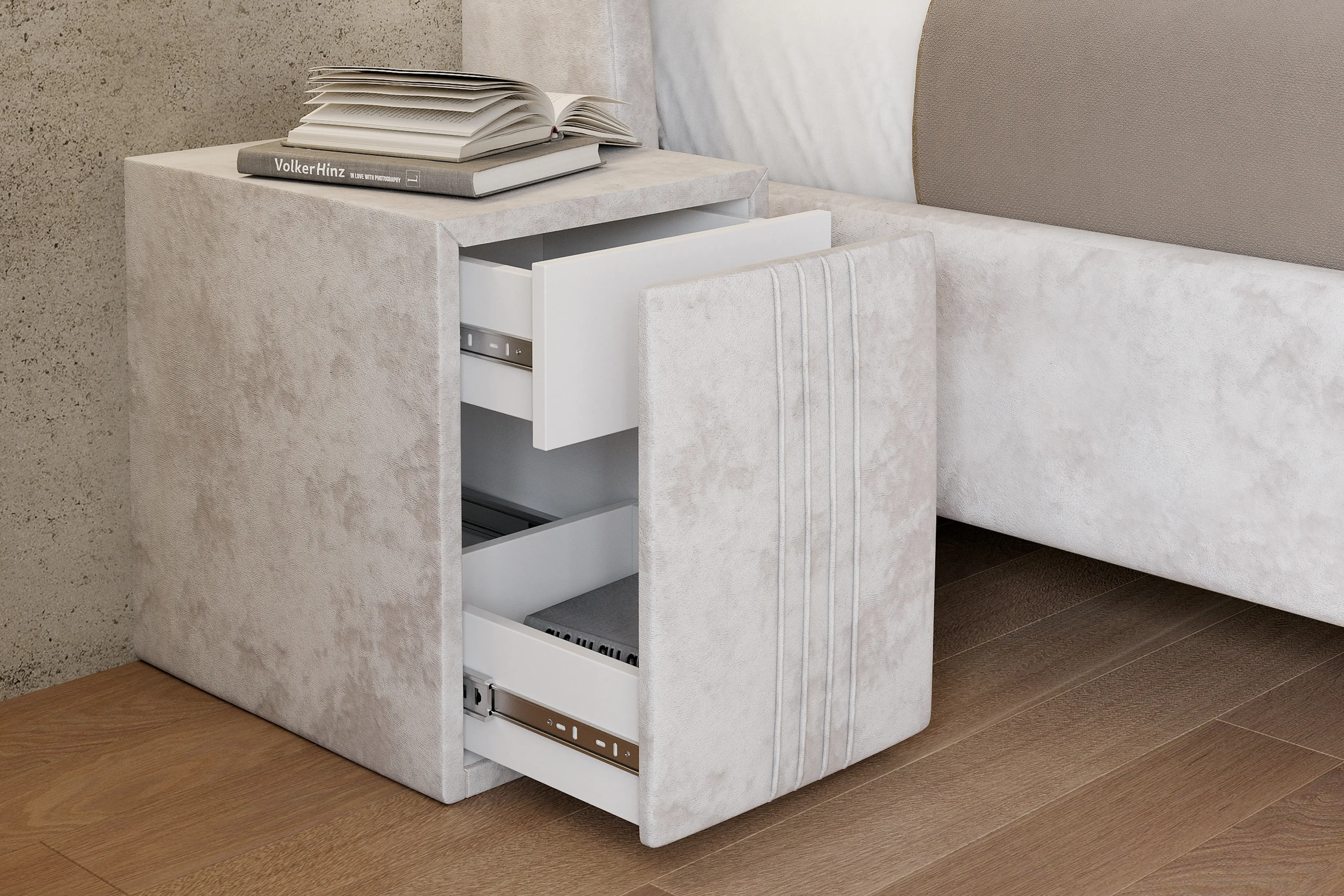 Тумба обтянута высококачественным велюром, имеет два вместительных выдвижных ящика с механизмом push to open. Скругленные торцы модели, минимизируют риск удариться в темноте.