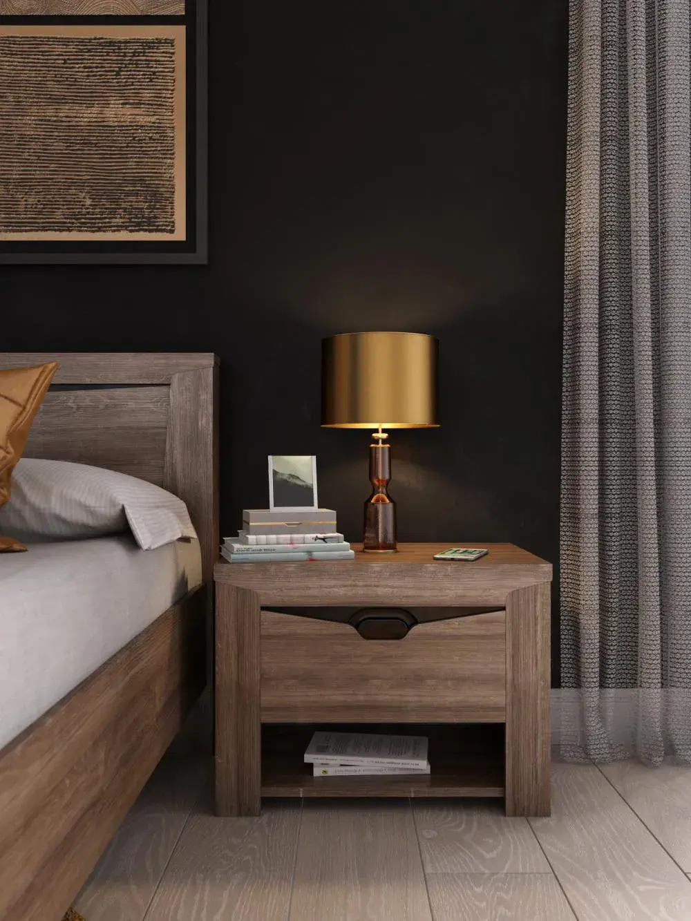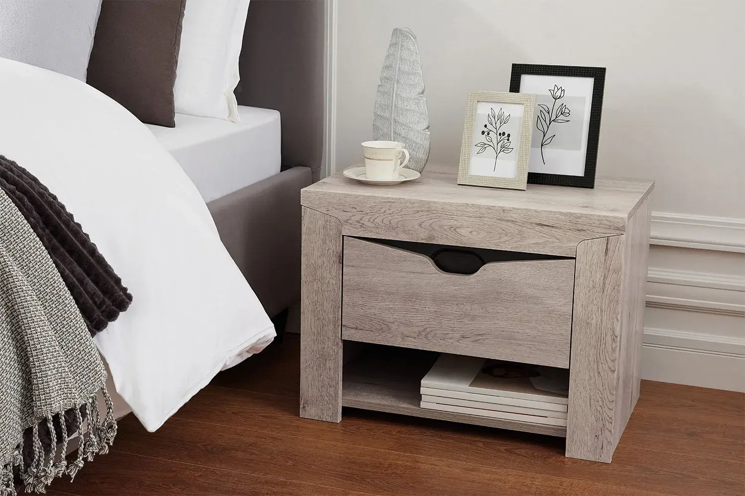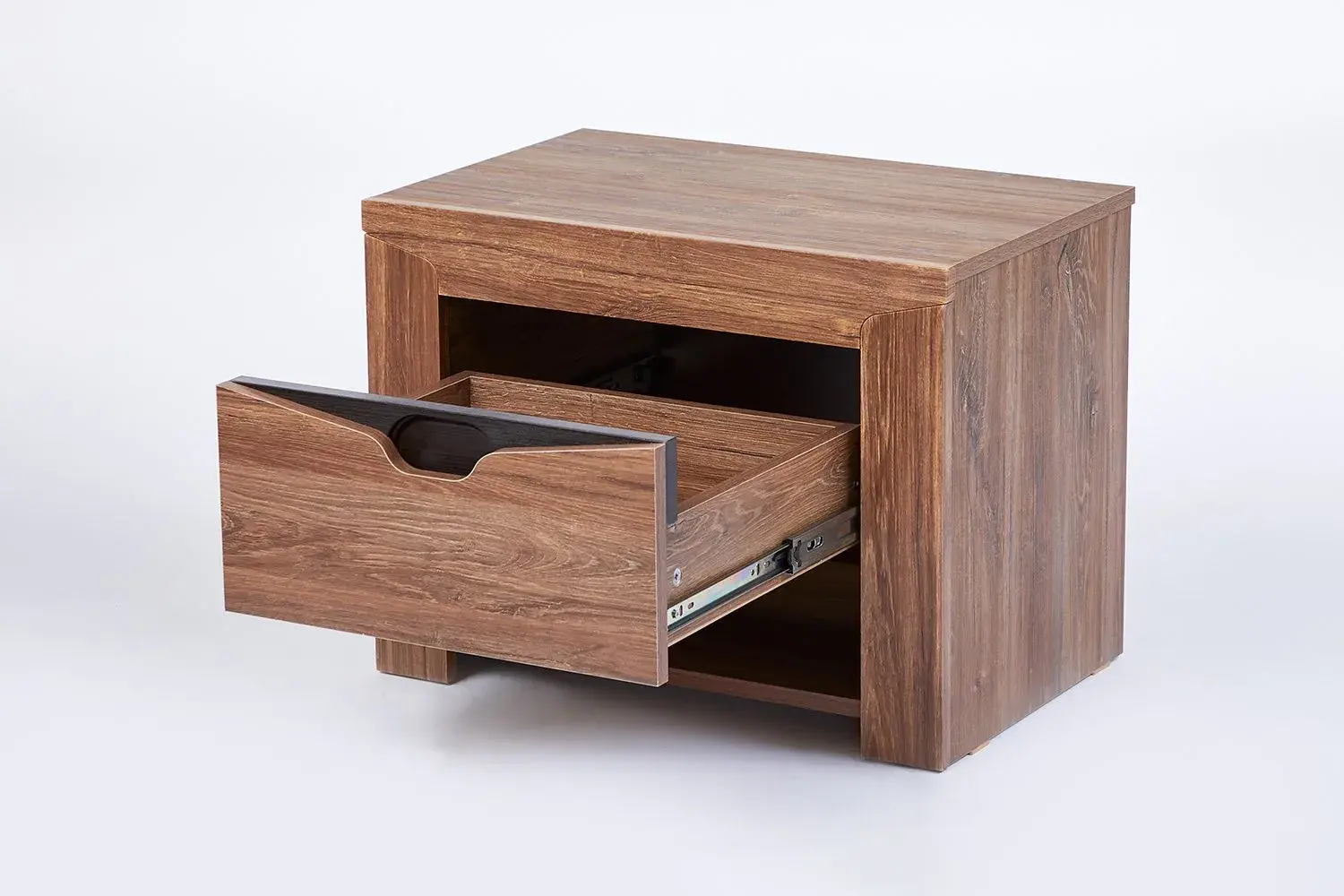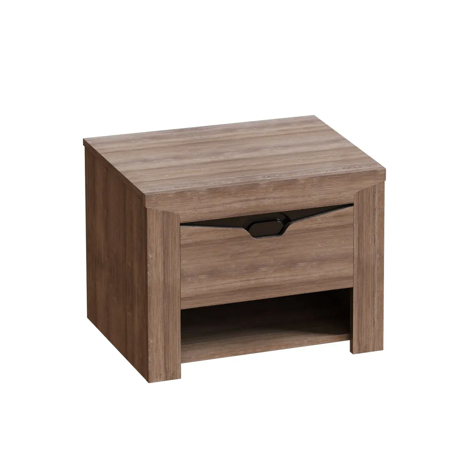 Прикроватная тумба "Соренто" имеет выдвижной ящик, для хранения мелких предметов, таких как пульт от телевизора, наушники, зарядные устройства. Открытое отделение тумбы позволяет хранить книги, журналы и другие предметы на видном месте. На фасаде имеется декоративный вырез, выполняющий функцию ручки.
